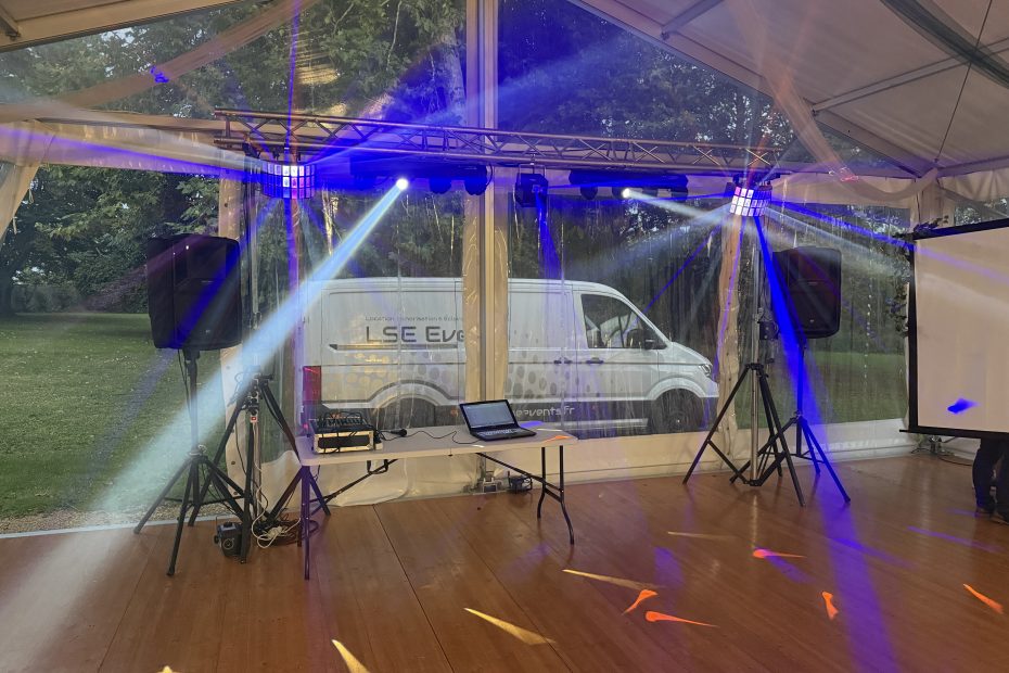 Location sonorisation et éclairage pour mariage au Château des Aulnes. Installation complète par nos soins, pour que tout soit prêt sans effort pour les mariés.
